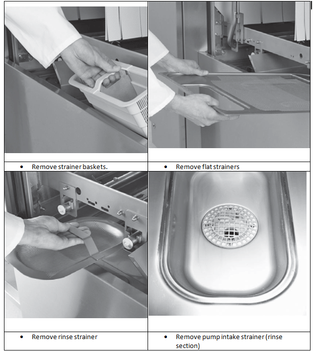 Note: Hose down and brush the strainers – do not knock them to dislodge food soil! They could be damaged.
